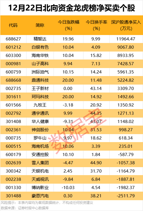 今日龙虎榜现身个股中,14股获北向资金净买入,其中精智达获北向资金净买入超1亿元,居首;白银有色(维权)、海南华铁(维权)获北向资金净买入均超8000万元。