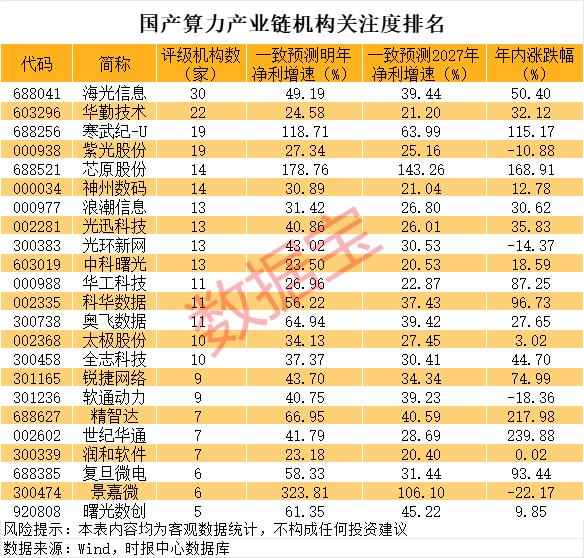 数据宝统计出未来业绩有望持续高成长的国产算力概念股。根据5家及以上机构评级,有23只概念股机构一致预测2026年、2027年净利增速均超20%。其中,海光信息、寒武纪-U、芯原股份、光环新网等个股净利增速均有望超30%。