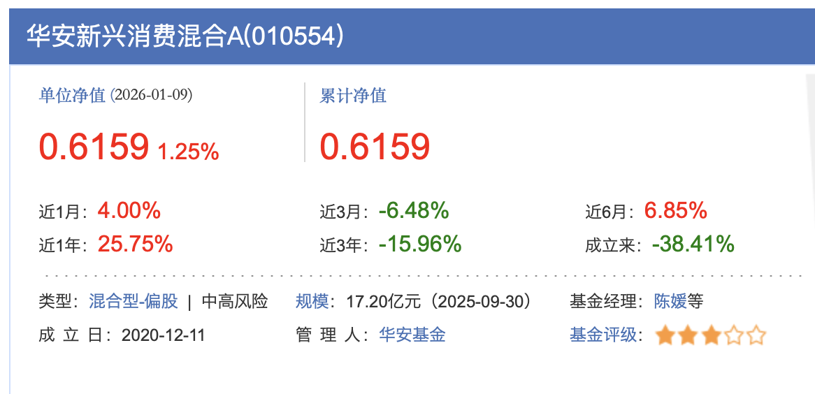 最明显的当属成立于2020年12月11日的华安新兴消费混合A,发行期共募集62.68亿元,受到市场广泛关注,基金经理陈媛作为华安基金自主培养的消费投资专家,也因其出色的业绩被称为“消费女神”。截至2026年1月9日,这只基金单位净值仅为0.6159元,自成立以来收益率为-38.41%,在同类基金中排名靠后。