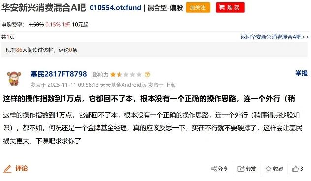 行业低迷阶段往往是判断基金经理选股能力的关键时期,因为这不同于行业繁荣阶段的一荣俱荣。在华安优质生活混合基金的评论区,一位投资者留下这样一句话:“这样的操作指数到1万点,它都回不了本。”