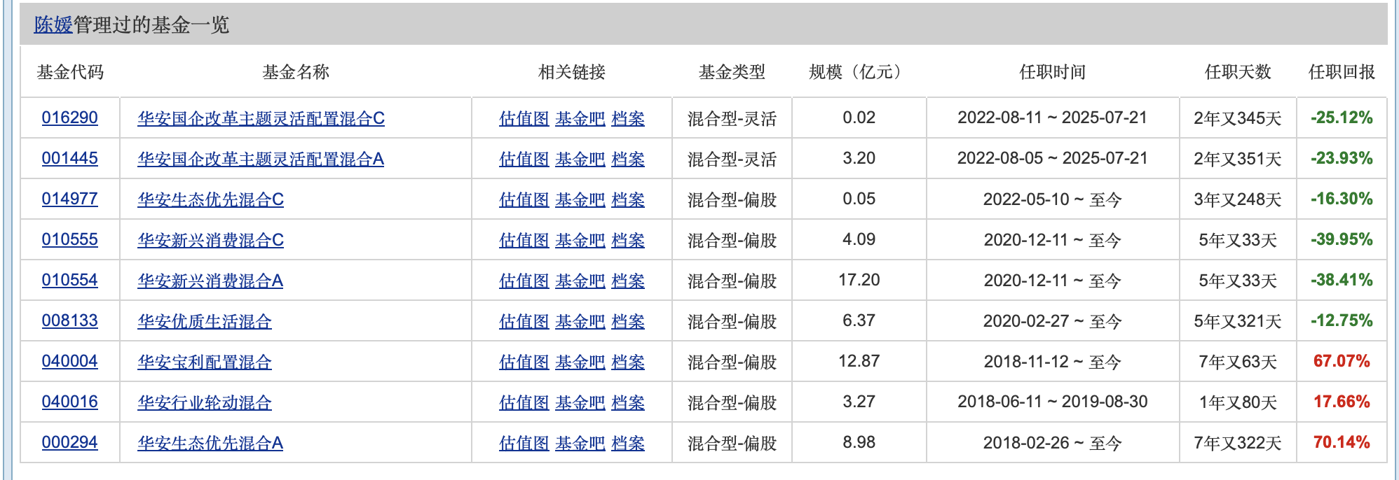 从业绩来看,陈媛管理的基金产品近期表现全面疲软,截至2026年1月12日的数据显示,她管理的多只基金业绩均不理想。华安新兴消费混合A自2020年12月成立以来收益率为-38.41%,同期同类基金平均收益为20.72%,差距显著;华安优质生活混合自2020年2月成立以来收益率为-12.75%;即使是曾经业绩突出的华安生态优先混合A,虽然自2018年2月管理以来取得了70.14%的正收益,但仍跑输同类平均的88.60%。