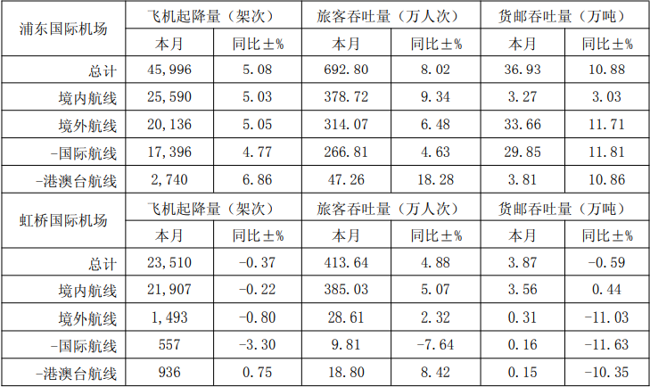 1月14日,上海机场(600009)发布公告,2025年12月,浦东国际机场的飞机起降量为4.60万架次,同比增长5.08%;旅客吞吐量为692.80万人次,同比增长8.02%;货邮吞吐量为36.93万吨,同比增长10.88%。