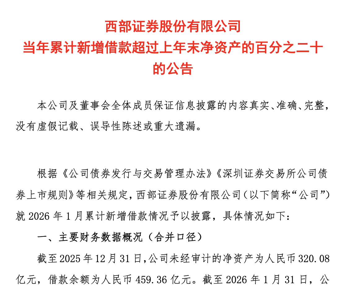 2月5日,西部证券(002673)发布公告,披露截至2026年1月31日,公司累计新增借款人民币80.66亿元,占上年末未经审计净资产320.08亿元的25.20%,远超20%的披露红线。而在刚刚过去的2025年,西部证券总共四次因为新增借款超过规定比例而发布公告。
