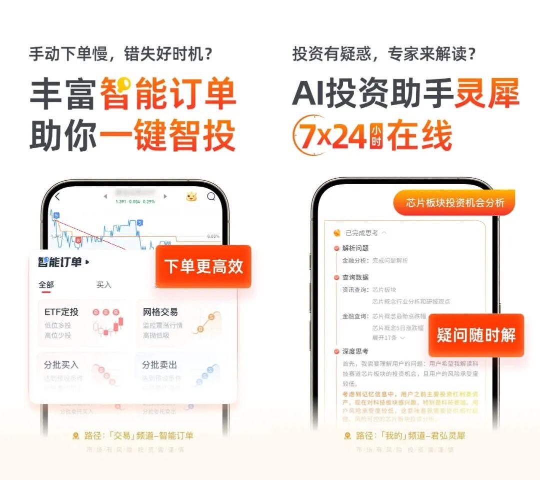 君弘APP主动拥抱智能体时代,依托君弘智投服务体系,构建覆盖“投前-投中-投后”全场景服务闭环,以AI赋能重塑智能投资体验。投前通过智能体实时处理海量资讯与数据并生成市场热点专题与策略盯盘信号,结合客户MBTI波动耐受度结果匹配策略;投中引导设置定投与止盈,强化投资纪律执行;投后提供账户诊断、智能复盘、“投资镜子”等工具,为投资者提供全方位智能护航。