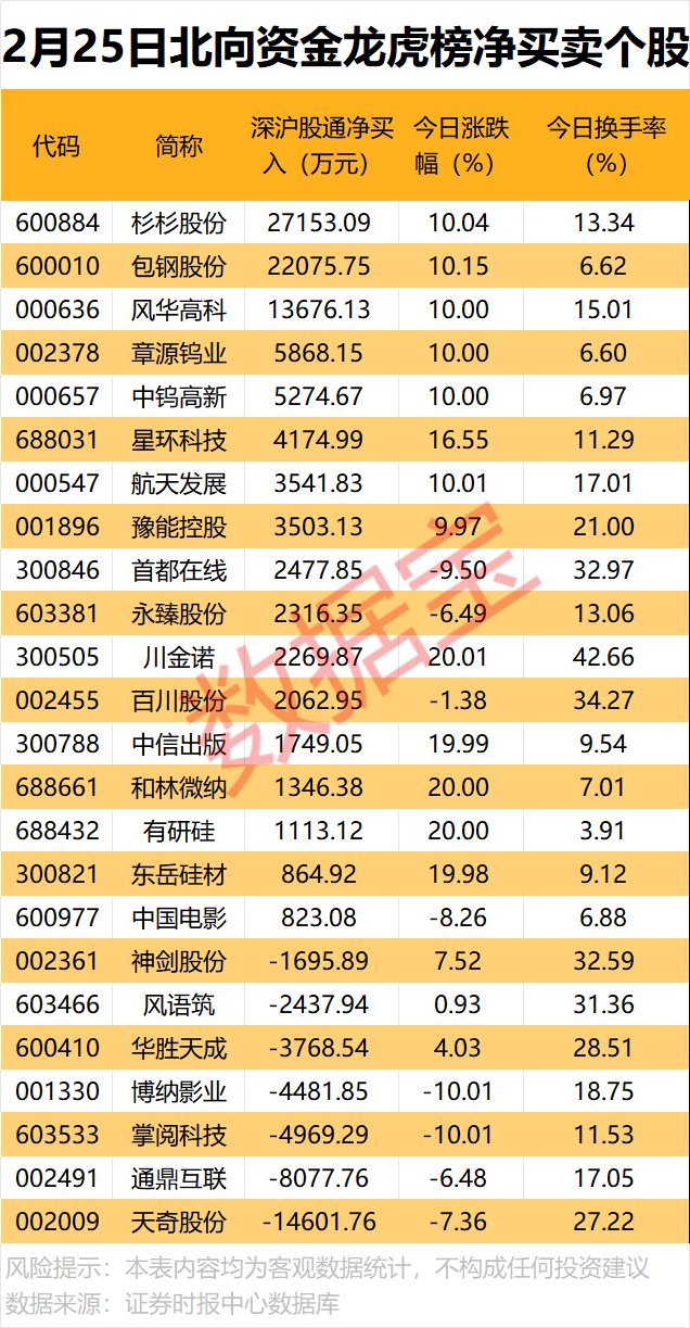 北向资金净买入金额居首的是杉杉股份(维权),净买入达2.72亿元;其次是包钢股份、风华高科、章源钨业,净买入金额分别为2.21亿元、1.37亿元、5868.15万元。