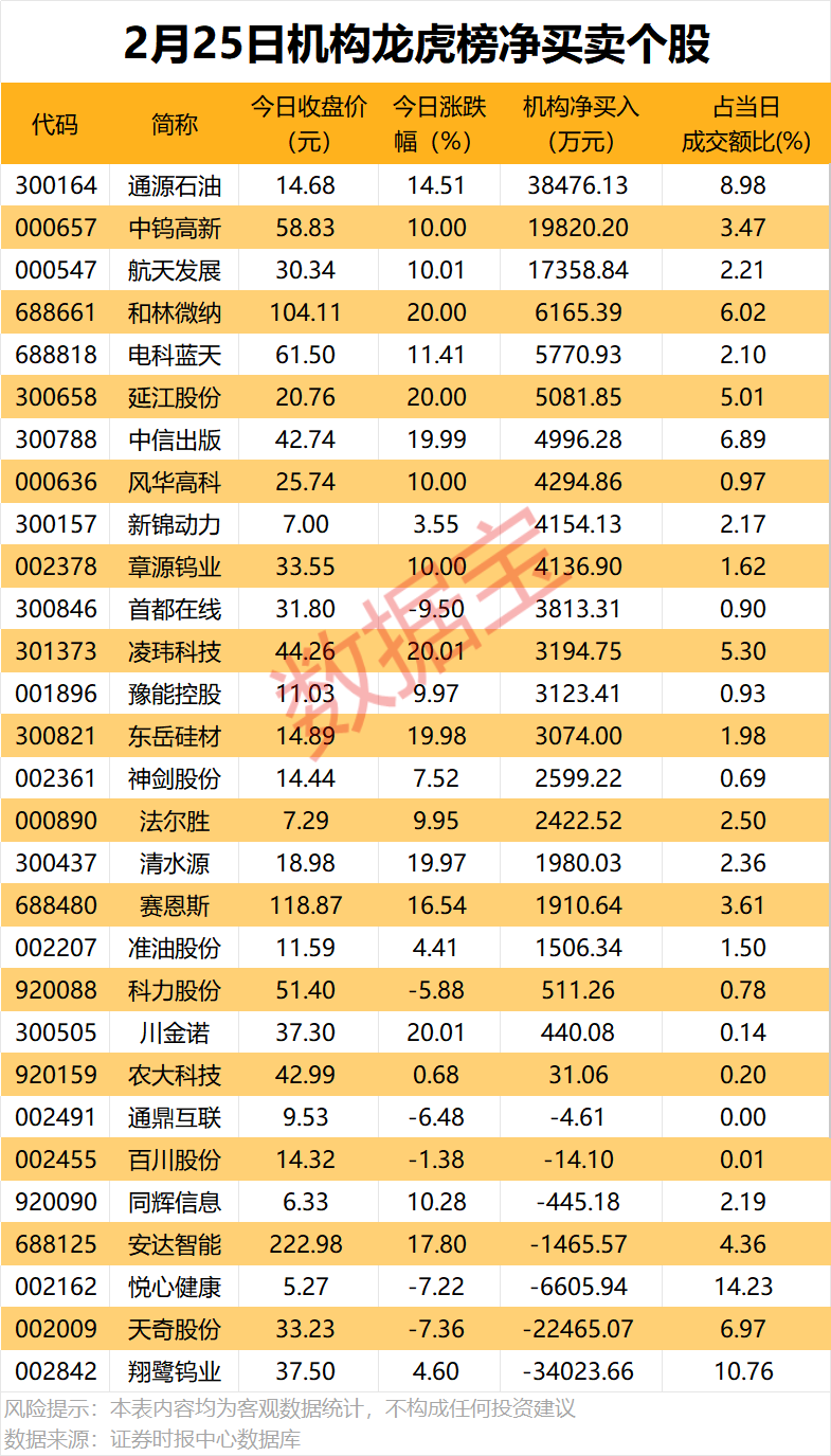 据数据宝统计,2月25日龙虎榜中,机构席位资金净买入6.98亿元,其中净买入的个股为22只,净卖出的个股达7只。