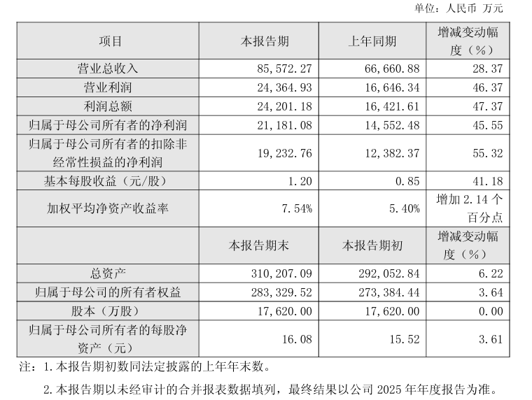 2月26日,中触媒(688267)发布公告,2025年度主要财务数据初步核算显示。报告期内,公司实现营业总收入8.56亿元,较上年同期增加28.37%;归母净利润2.12亿元,较上年同期增加45.55%。