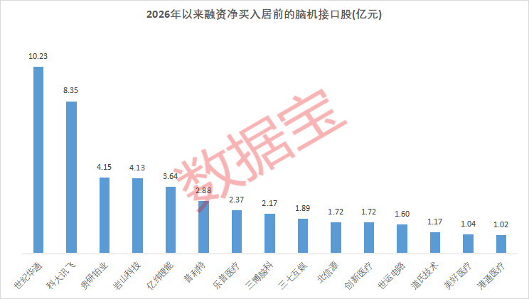 证券时报·数据宝梳理了2026年以来,融资净买入居前的脑机接口股,其中超过1亿元的共计15只(截至3月5日),世纪华通(维权)、科大讯飞排名靠前,净买入额分别为10.23亿元、8.35亿元。