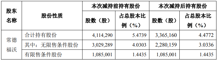 3月11日,飞沃科技(301232)发布公告,原持股5%以上股东常德福沃通过集中竞价方式累计减持75万股,占公司总股本的0.9967%,减持均价为202.67元,减持总金额约为1.52亿元。