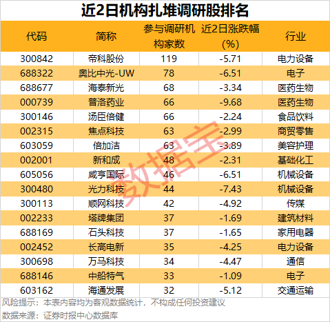 近两个交易日(3月19日至3月20日)共有58家公司公告机构调研记录,其中,17家公司获30家以上机构扎堆调研。最受关注的是帝科股份,有119家机构调研;其次是奥比中光-UW,有78家公司调研,海泰新光、普洛药业等均有超60家机构调研。