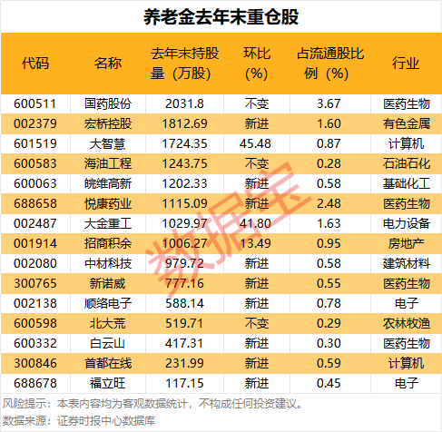 统计显示,养老金账户最新出现在15只个股前十大流通股东名单中,合计持股量1.48亿股,期末持股市值合计33.85亿元。