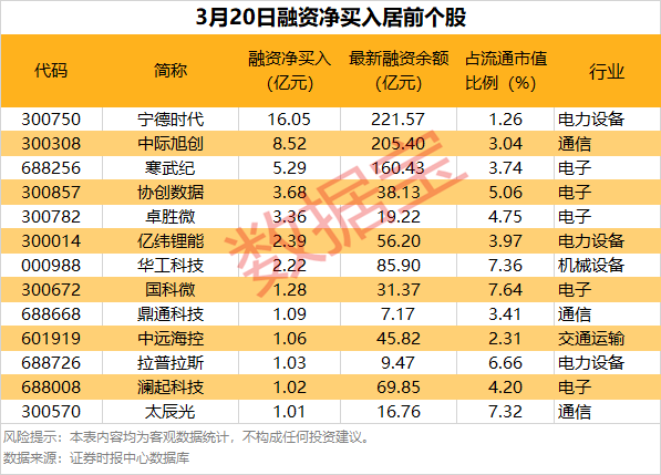 具体到个股,3月20日共有1288只股获融资净买入,净买入金额在千万元以上的有243只,其中13只融资净买入额超亿元。宁德时代融资净买入额居首,当日净买入16.05亿元;其次是中际旭创、寒武纪,融资净买入金额分别为8.52亿元、5.29亿元;融资净买入金额居前的还有协创数据、卓胜微、亿纬锂能(维权)等。