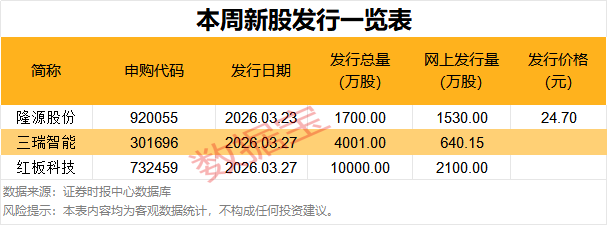 根据发行安排,本周暂有3只新股申购,本周一(3月23日)可申购隆源股份,本周五可申购三瑞智能、红板科技。