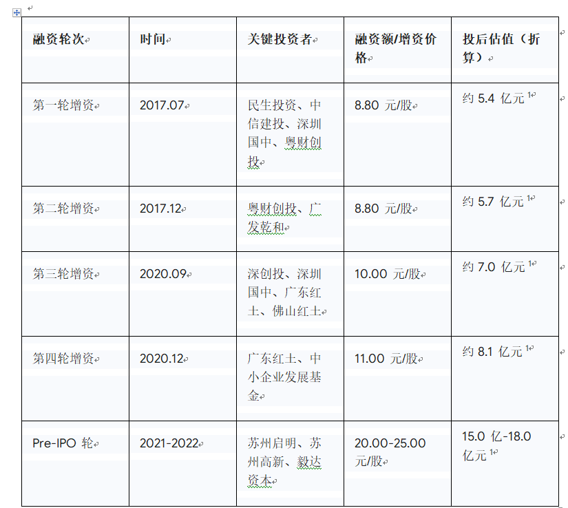 2017年7月,公司第一轮增资以8.8元/股引入民生投资、中信建投等机构,投后估值约5.4亿元;同年12月第二轮增资,粤财创投加码联合广发乾和入局,价格不变,估值升至约5.7亿元。2020年融资提速,9月第三轮以10元/股引入深创投、广东红土等国资机构,估值达7亿元;12月第四轮,广东红土追加投资,联合中小企业发展基金以11元/股注资,估值增至8.1亿元。2021-2022年Pre-IPO轮,以20-25元/股引入苏州启明等机构,估值达15亿-18亿元。