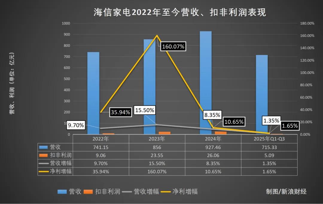 在她掌权期间,海信家电先后发布了三个季度的财务数据。《BUG》栏目统计发现,仅看2022年-2025年前三季度数据,今年的营收增速和扣非净利润增速均创新低,且大幅低于往年同期。
