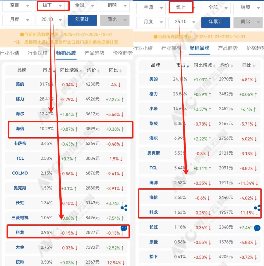 但从结果来看,目前这一改革计划的成效并未凸显。据奥维云网监测数据:2025年1月1日-10月30日,海信家电旗下海信、科龙品牌空调线下市场占有率分别为10.29%、0.96%,同比增长0.87%和-0.15%;同期,海信、科龙空调线上份额分别为2.55%、1.63%,分别下滑0.6%及0.28%,线上均价也同比下滑4.02%和11.15%。