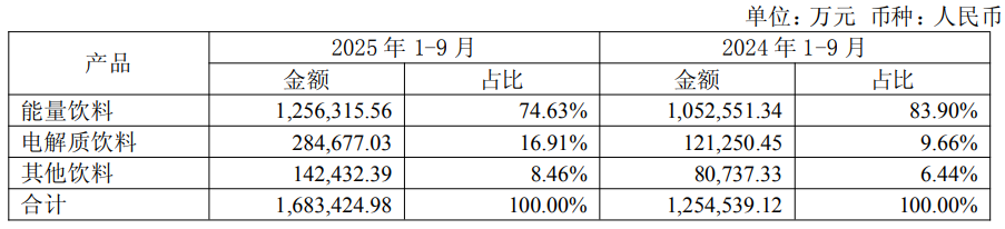 第二道坎就是产品结构。此前招股书显示,2022-2024年间,东鹏饮料的能量饮料收入分别为约82亿、104亿、133亿元,占比分别96.6%、91.9%、84.0%,2025前三季度占74.63%。虽然每年呈明显下降状态,但目前来看依然还是位居高位。