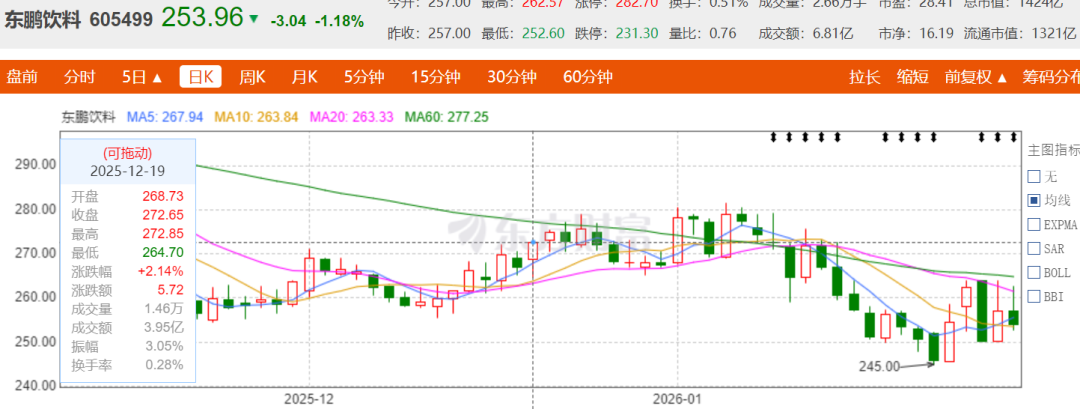一方面东鹏饮料H股开盘仅微涨0.56%,盘中一度跌破248港元的发行价,最终收盘报251.8港元,涨幅1.53%;另一边,其A股在同日下跌1.18%,呈现分化格局。