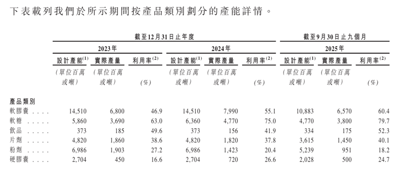 《每日财报》注意到,尽管海外市场销售规模持续扩大,但是仙乐健康的产能利用率尚未饱和,新增产能能否消化存疑。招股书显示,其主要产品分别有软胶囊、软糖、饮品、片剂、粉剂和硬胶囊,2025年前三季度,除软糖外,其余产品产能利用率均低于70%,片剂、粉剂和硬胶囊的产能利用率甚至不足50%。