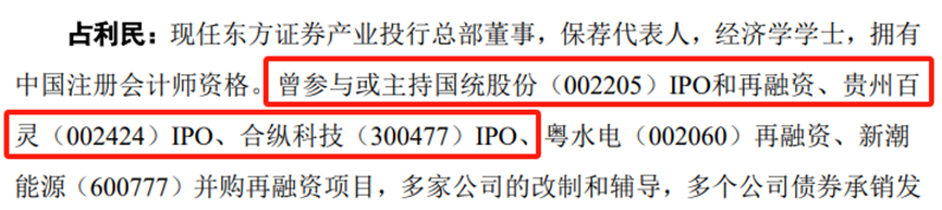 既然说到了信息披露质量,力场君还关注到乔路铭IPO的保荐代表人之一,也挺有故事的。根据《发行保荐书》公布的信息,占利民曾参与或主持过的IPO项目并不多,包括了国统股份(002205.SZ)、贵州百灵(002424.SZ)、合纵科技(300477.SZ),这三家公司在上市后,在信息披露方面,都出了些问题。