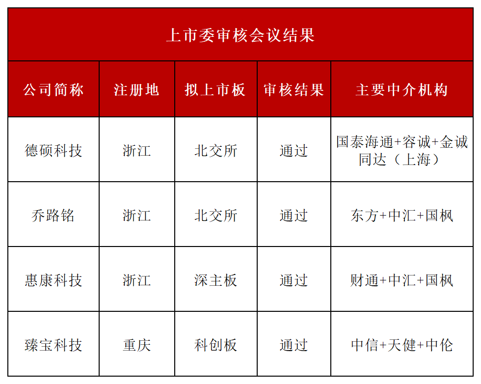 据大象君了解,北交所上市委员会2026年第19、20次审议会议;深交所上市委员会2026年第10、11次审议会议;上交所上市委员会2026年第7次审议会议共于3月5日召开,共审议6家企业,包括4家IPO企业和2家再融资企业,均获通过。