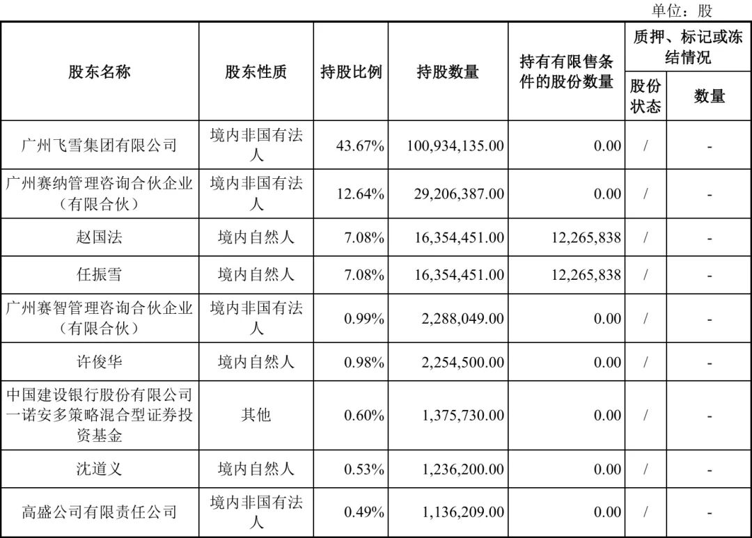 截至本募集说明书签署日,飞雪集团持有公司股权比例为 43.67%,广州赛纳股权投资合伙企业(有限合伙)持股比例为12.64%,广州赛智股权投资合伙企业(有限合伙)持股比例为0.99%,任振雪直接持股比例为7.08%,赵国法直接持股比例为7.08%。前述法人主体均为实际控制人任振雪、赵国法夫妇控制的企业。公司实际控制人为任振雪、赵国法夫妇,合计控制公司71.46%的股份,为公司共同实际控制人。