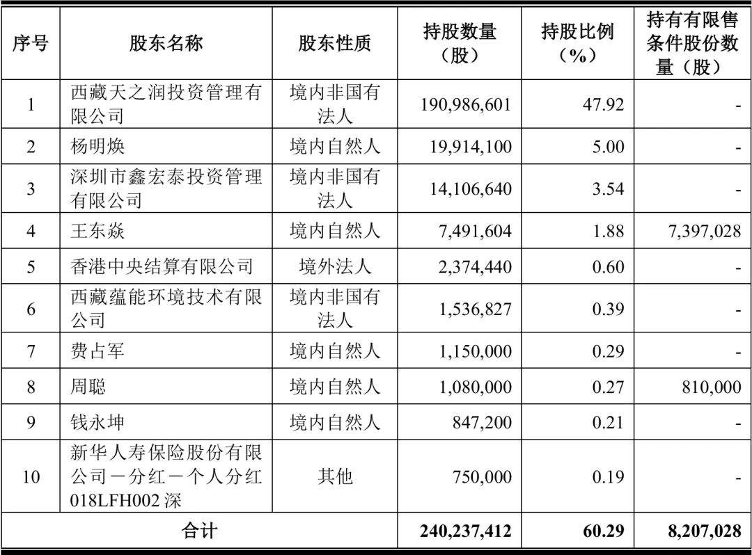 截至本募集说明书签署之日,西藏天之润直接持有发行人171,057,001股股份,占发行人总股本的比例为 42.92%;同时,西藏天之润通过控制深圳鑫宏泰间接控制发行人3.54%的股份,合计控制发行人46.46%股份,因此,西藏天之润为发行人的控股股东。