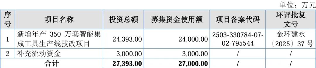 此次IPO拟募集2.7亿元,用于新增年产350万套智能集成工具生产线技改项目、补充流动资金。