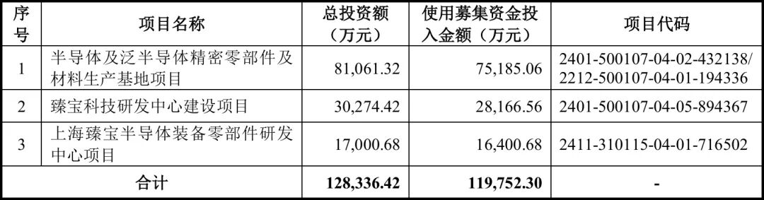 此次IPO拟募集资金11.98亿元,用于半导体及泛半导体精密零部件及材料生产基地项目、臻宝科技研发中心建设项目、上海臻宝半导体装备零部件研发中心项目。