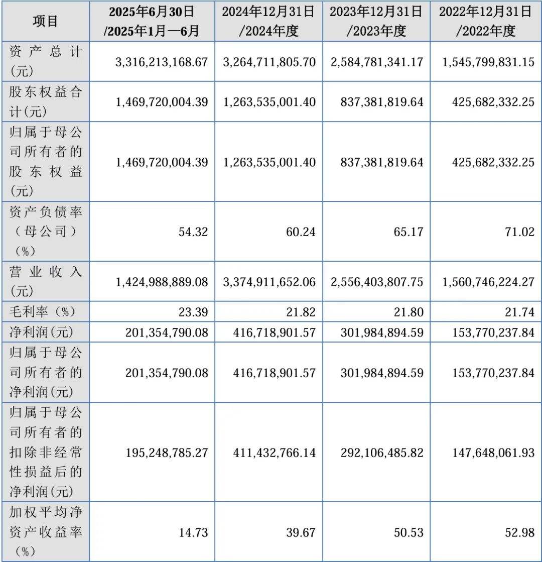 2022年-2024年及2025年1-6月,公司营业收入分别为15.61亿元、25.56亿元、33.75亿元和14.25亿元;同期实现扣非归母净利润分别为1.48亿元、2.92亿元、4.11亿元和1.95亿元。