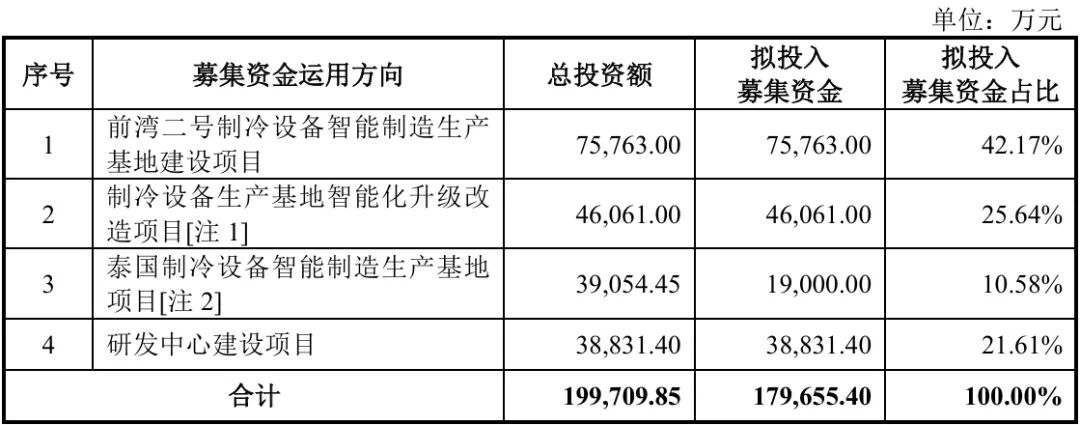 此次IPO拟募集资金17.97亿元,用于前湾二号制冷设备智能制造生产基地建设项目、制冷设备生产基地智能化升级改造项目、泰国制冷设备智能制造生产基地项目、研发中心建设项目。