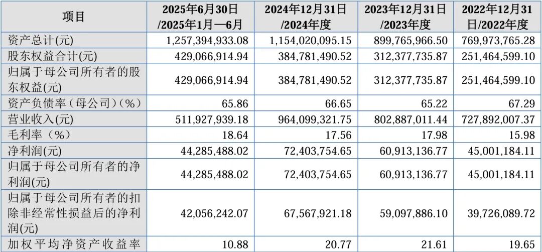 2022年-2024年及2025年1-6月,公司营业收入分别为3.86亿元、5.06亿元、6.35亿元和3.66亿元;同期实现扣非归母净利润分别为7779.90万元、1.05亿元、1.45亿元和8543.38万元。