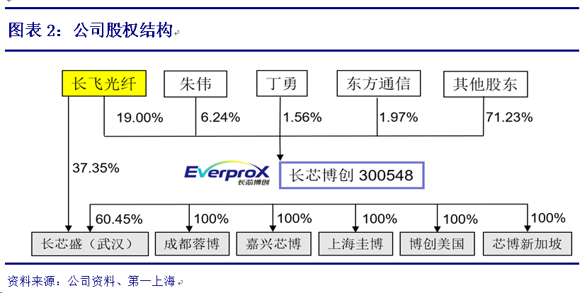 公司第一大股东为长飞光纤,直接持有公司19.0%股权。公司股权结构较为分散。在长芯盛成为长芯博创控股子公司后,公司组建新的管理团队,确立了职业化管理模式的推行方向,即统一的经营决策和绩效管理体系,并整合精英团队实现“1+1>2”的协同效应。公司多位高管曾经或现在仍在母公司长飞光纤和核心子公司长芯盛任职,有利于实现上下游协同和资源整合