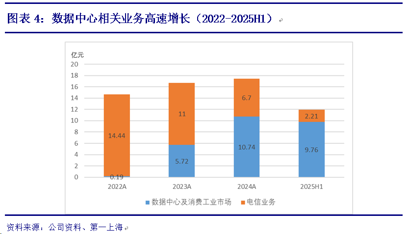公司业务重心逐步向数据中心转型。2025年上半年,得益于人工智能的高速发展,公司数据中心相关收入高速增长,而同期受行业周期和市场价格竞争双重影响,电信市场业务出现下滑