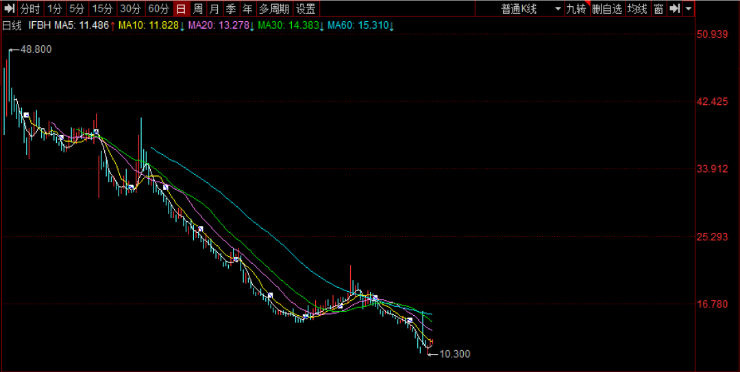 IFBH股价达到48.8港元/股的高点后,便一路下滑,9个月的时间,其股价下跌了76.3%,最低跌至10.3港元/股,市值蒸发近百亿港元,仅剩31亿港元。