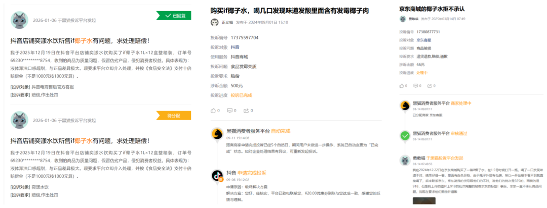 ▲消费者对IF椰子水的投诉,图源黑猫投诉