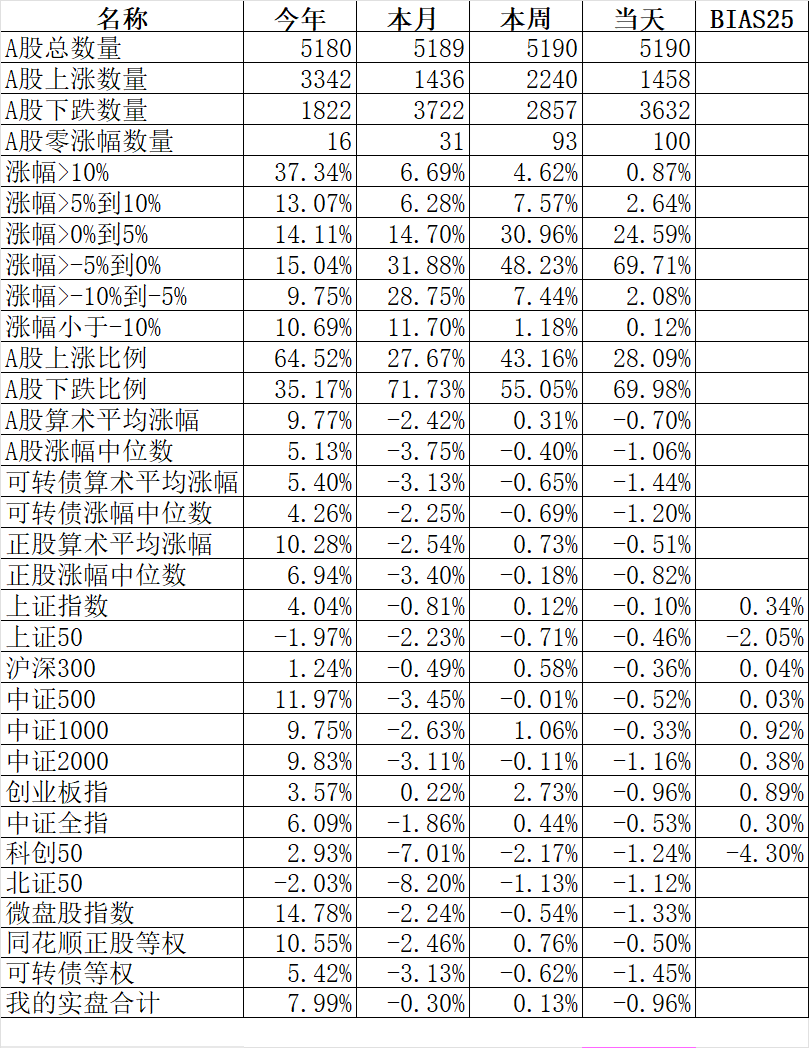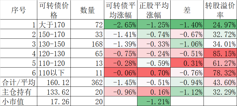 362只可转债平均下跌1.45%,对应正股平均下跌0.51%。我的主仓20只可转债平均下跌0.96%,对应正股平均上涨0.16%。