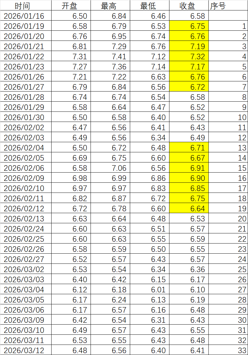 黄色部分的收盘价是超过了强赎触发价,从2月24日到3月9日这11个交易日里,只要有一天价格大于强赎触发价,就满足了强赎条件:连续30天里有15天收盘价大于强赎触发价。但到了3月10日这一天,即使收盘价大于强赎触发价,但同时要剔除1月19日满足强赎触发价的这一天,也就是说,即使3月10日起7个交易日每天都满足条件,因为同时剔除了满足条件的1月19日到1月27日,所以还是在30天里只有14天就满足条件,无法达到15天,这就是本来缺1天,突然就变成缺8天的原因。