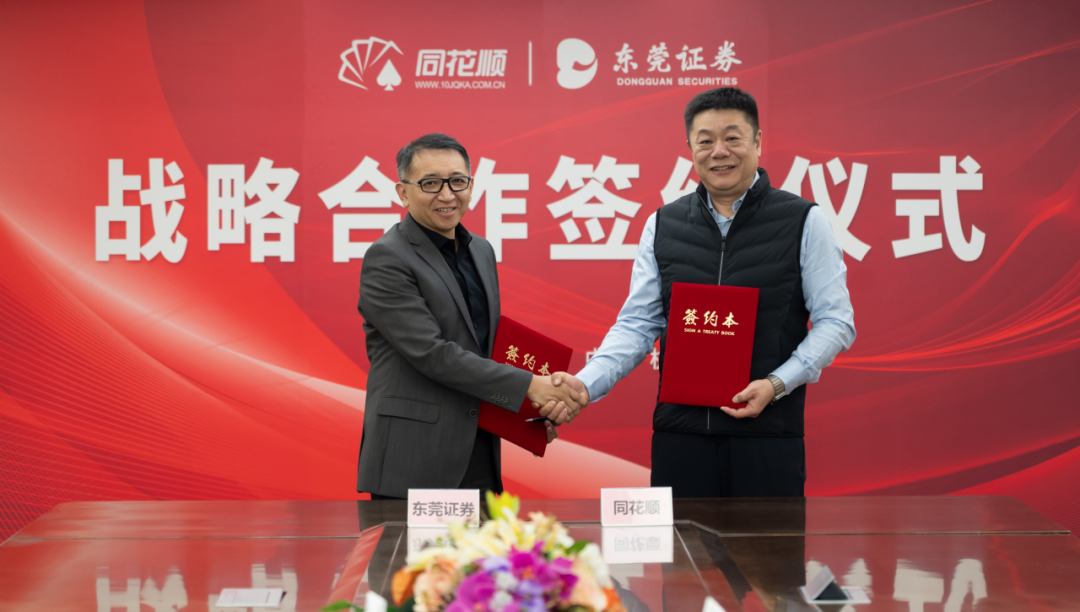 3月12日,东莞证券与同花顺在杭州正式签署战略合作协议,东莞证券总裁杨阳和同花顺副总裁朱志峰代表双方签约。