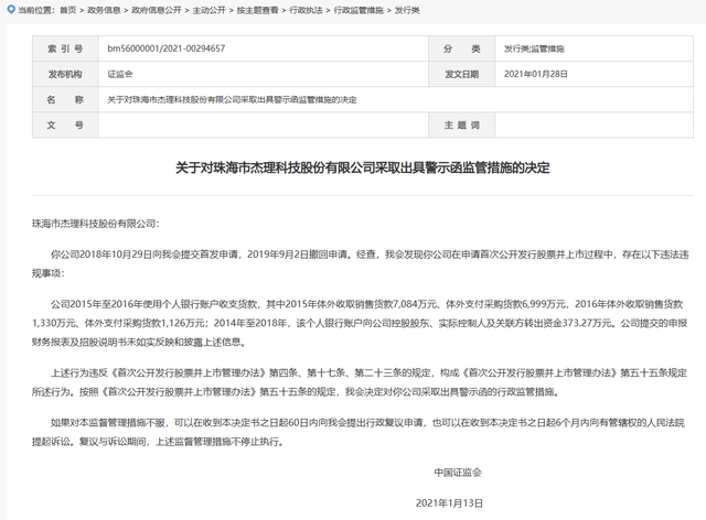 2018年11月,杰理科技再次冲刺沪市主板IPO,募资规模缩水至5.87亿元。此次申请中,杰理科技被证监会抽中现场检查,后于2019年9月撤回了申请材料。随后于2021年1月,证监会发布公告,对杰理科技采取出具警示函的行政监管措施。