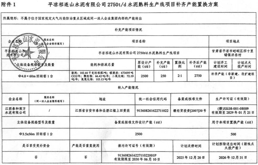 根据公示,平凉祁连山水泥有限公司2750t/d水泥熟料生产线原设计产能2500t/d,补充产能250t/d,置换比例为2:1。江西泰和南方水泥有限公司一条2500t/d熟料线中的500t/d用于本项目置换产能,计划今年年底前拆除退出。