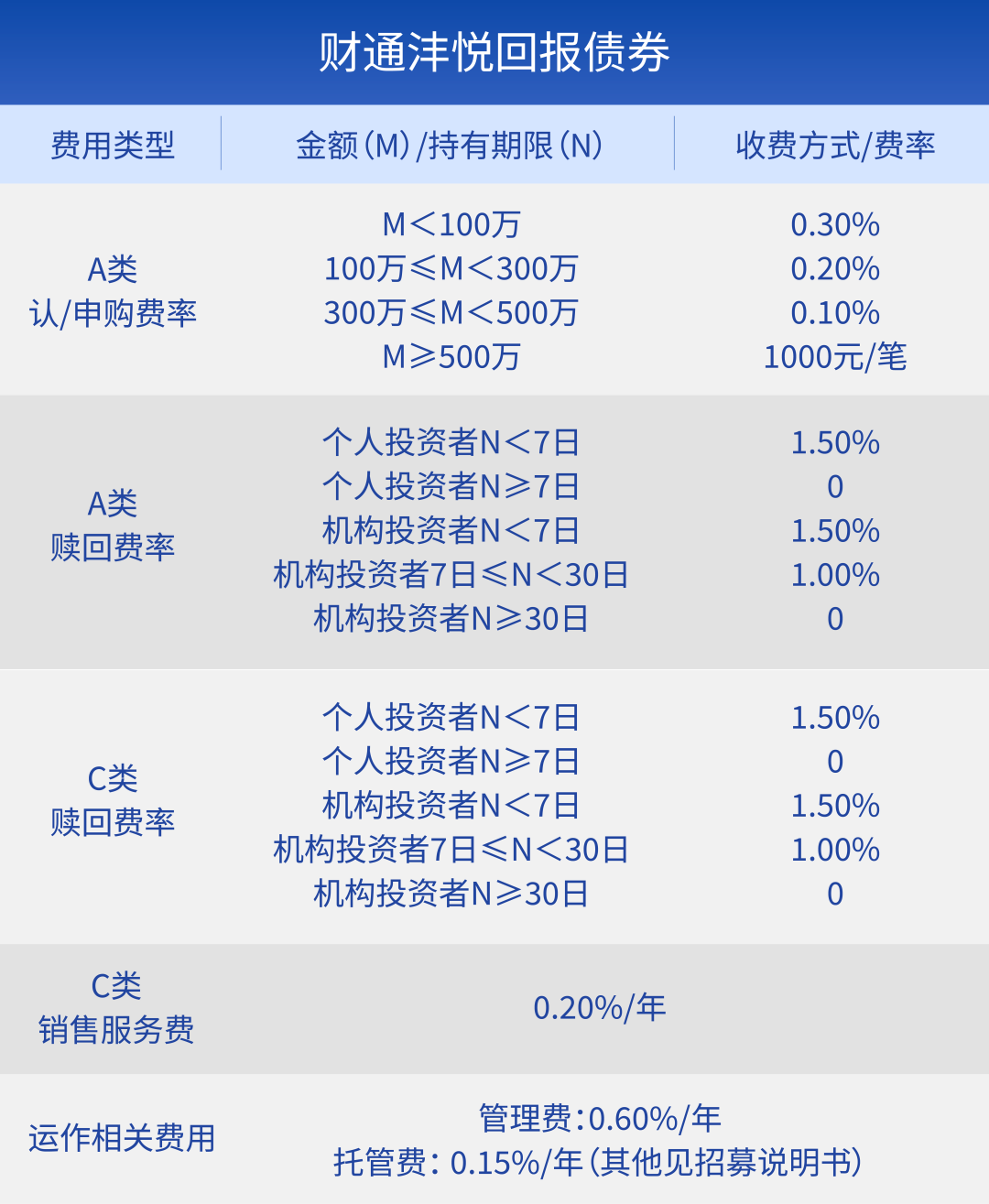 上表适用于投资者通过其他销售机构认购/申购本基金A类基金份额。通过直销机构(含基金管理人及其销售子公司)认购/申购本基金A类基金份额的,不收取认购费/申购费。赎回费用由赎回基金份额的基金份额持有人承担,在基金份额持有人赎回基金份额时收取。投资人赎回基金份额产生的赎回费用全额计入基金财产。销售服务费适用于投资者通过其他销售机构认购/申购且持续持有期限未超过一年的C类基金份额。对于投资者通过直销机构认购/申购的C类基金份额,计提的销售服务费将在投资者赎回相应基金份额或基金合同终止时随赎回款或清算款一并返还给投资者;对于投资者通过其他销售机构认购/申购的C类基金份额,持有超过一年继续计提到的销售服务费将在投资者赎回相应基金份额或基金合同终止时随赎回款或清算款一并返还给投资者。