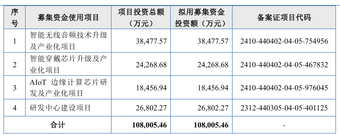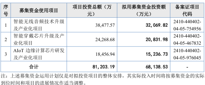 在此次上会版的招股书中显示,杰理科技计划募集资金缩减至6.81亿元,其中3.21亿元用于智能无线音频技术升级及产业化项目,2.08亿元用于智能穿戴芯片升级及产业化项目,1.52亿元用于AIoT边缘计算芯片研发及产业化项目。