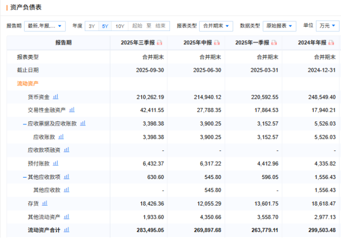 在手现金的持续缩水,进一步加剧了香飘飘的财务压力。从资产负债表数据来看,2024年末,香飘飘流动资产合计29.95亿元,到2025年9月底,流动资产合计降至28.35亿元,9个月内减少1.6亿元;资产合计从2024年末的48.73亿元,降至2025年9月底的47.23亿元,资产规模持续收缩。