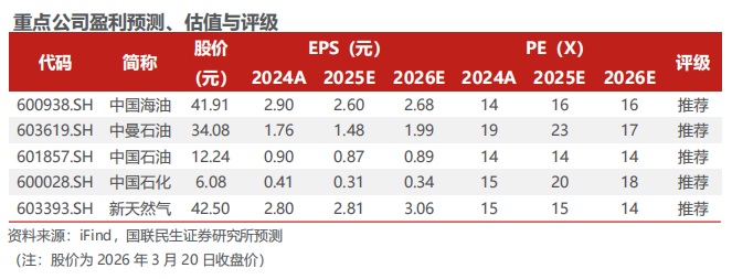投资建议:推荐以下三条主线:1)油价上涨阶段业绩弹性较大,兼具高分红特点的中国海油;2)产量处于成长期的中曼石油、新天然气;3)行业龙头、持续高分红的中国石油、中国石化。