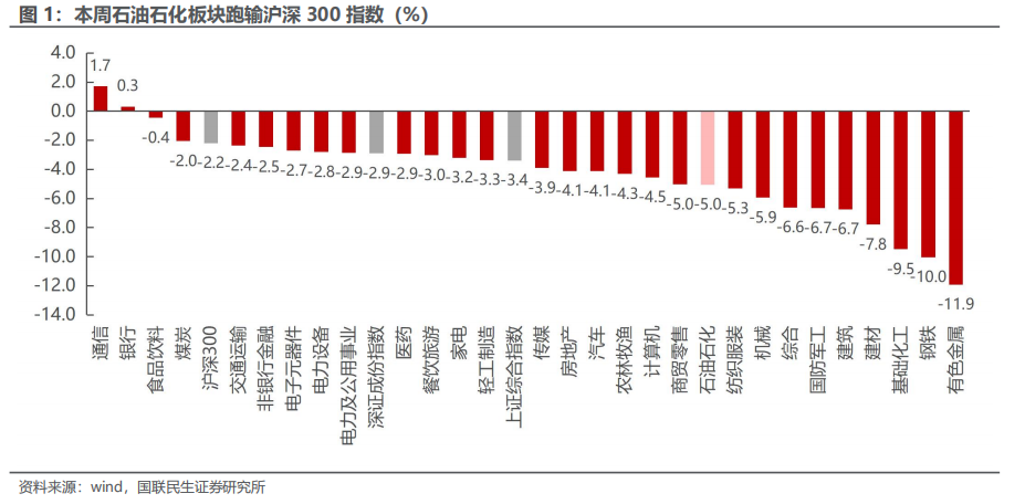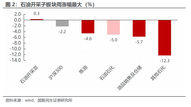 截至3月20日,本周沪深300下跌2.2%,中信石油石化板块下跌5.0%。各子板块中,石油开采子板块周涨幅最大,为0.3%;其他石化子板块周跌幅最大,为-12.3%。