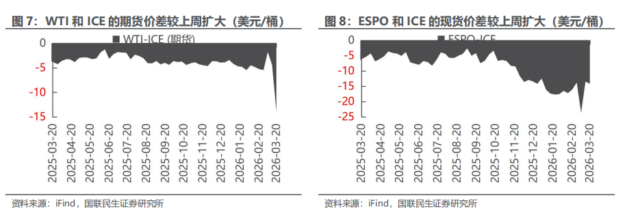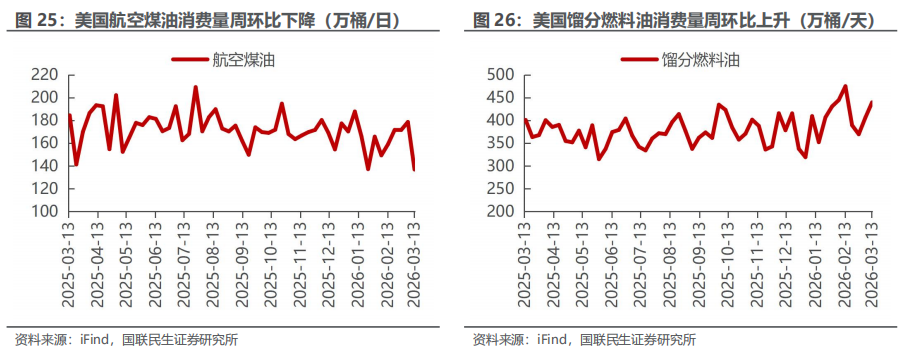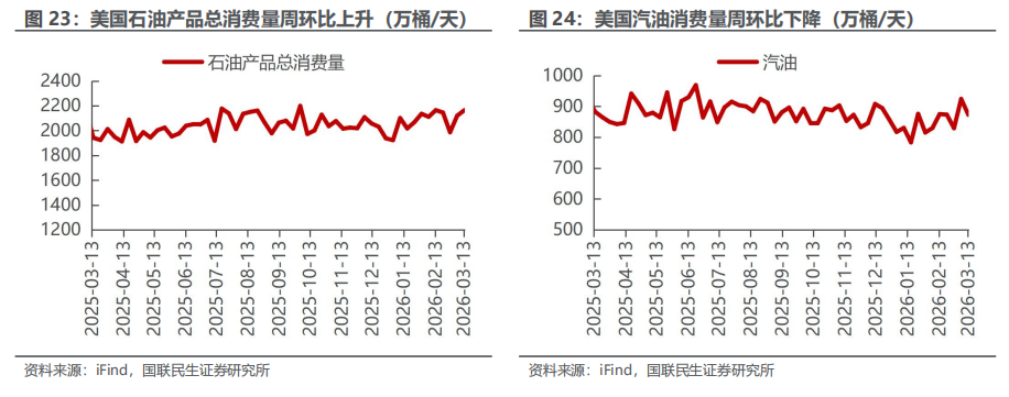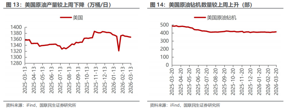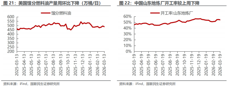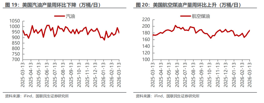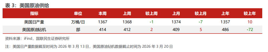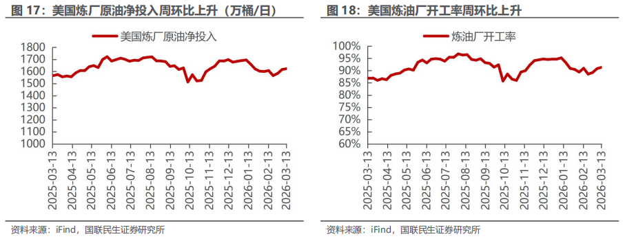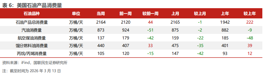 美国原油产量下降,炼油厂日加工量上升。截至3月13日,1)原油方面,美国原油产量1367万桶/日,周环比-1万桶/日。2)成品油方面,美国炼油厂日加工量1623万桶/日,周环比+6万桶/日;炼厂开工率91.3%,周环比+0.5pct;汽油/航空煤油/馏分燃料油产量分别为943/188/487万桶/日,周环比-46/+7/-8万桶/日。