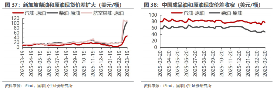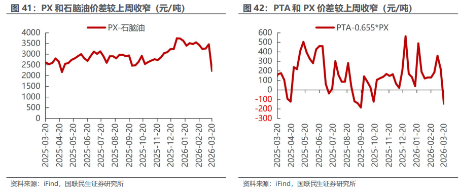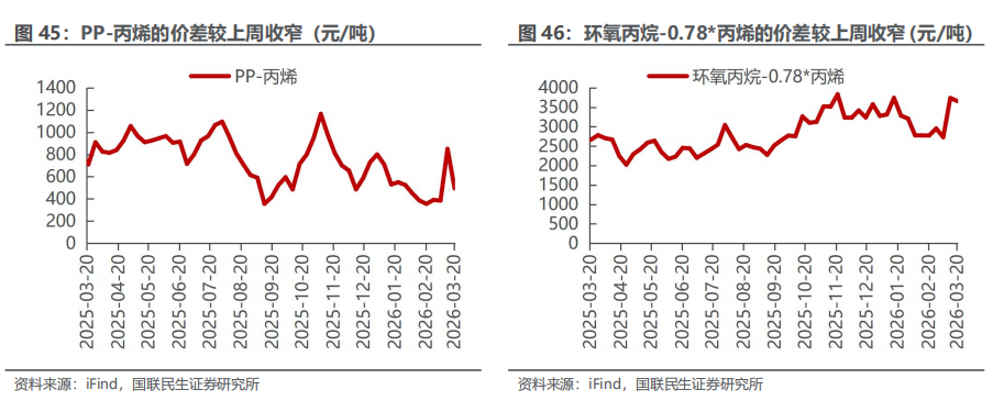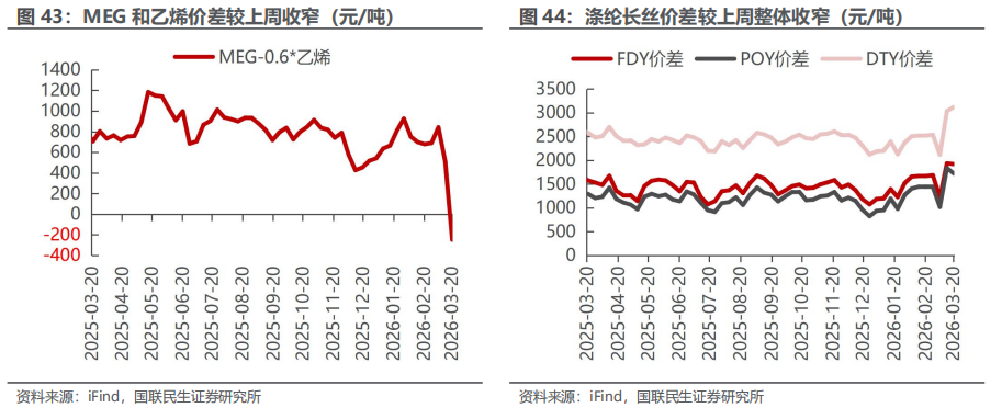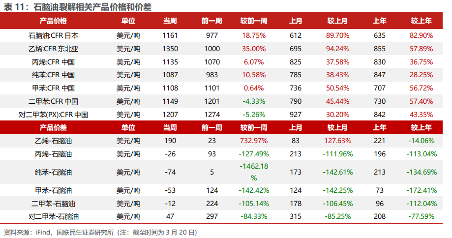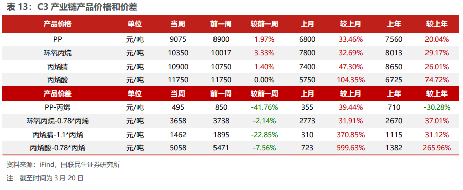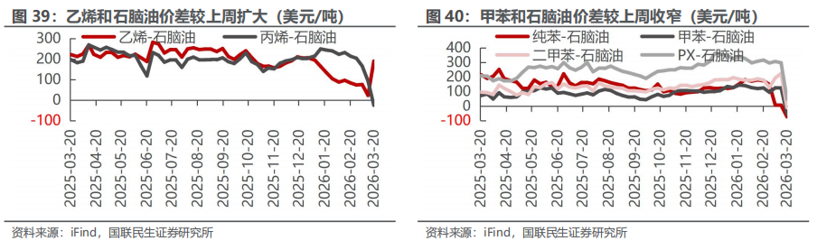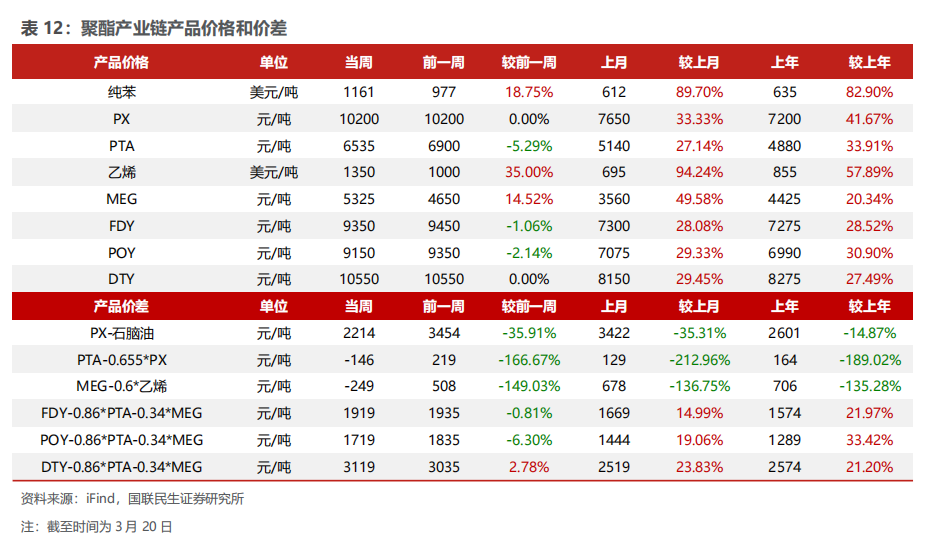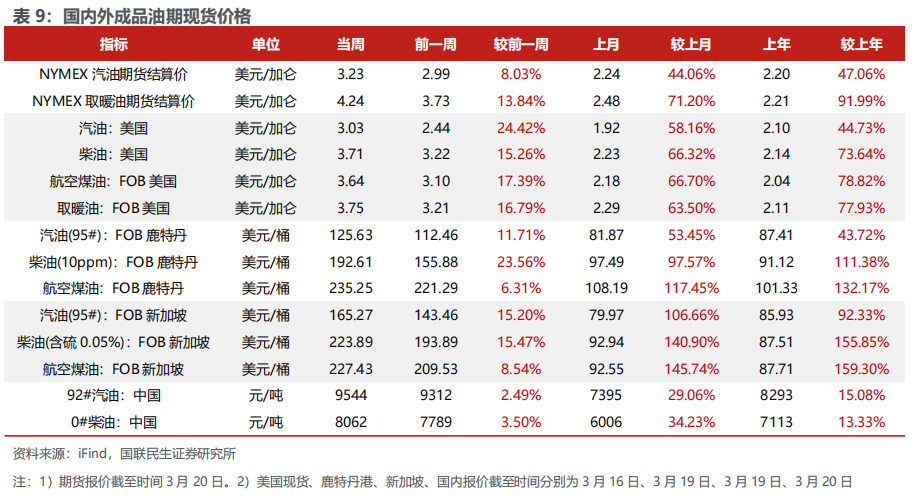 汽油价差扩大。截至3月20日,1)炼油板块,NYMEX汽油和取暖油期货结算价3.23/4.24美元/加仑,周环比+8.03%/+13.84%,和WTI期货结算价差为37.42/79.87美元/桶,周环比+38.91%/+38.14%。2)截至3月20日,化工板块,乙烯/丙烯/甲苯和石脑油价差分别为190/-26/-53美元/吨,较上周变化+732.97%/-127.49%/-142.42%;FDY/POY/DTY价差为1919/1719/3119元/吨,较上周变化-0.81%/-6.30%/+2.78%。