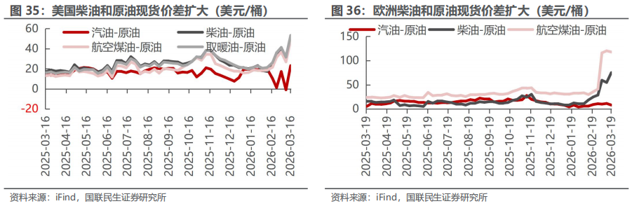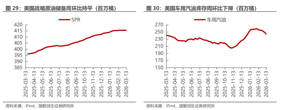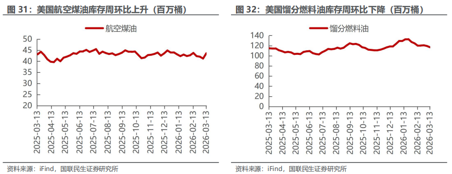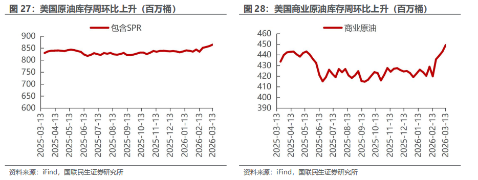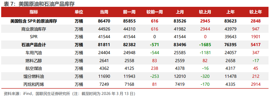 美国原油库存上升,汽油库存下降。截至3月13日,1)原油方面,美国战略原油储备41544万桶,周环比持平;商业原油库存44926万桶,周环比+616万桶。2)成品油方面,车用汽油/航空煤油/馏分燃料油库存分别为24404/4362/11690万桶,周环比-544/+238/-253万桶。