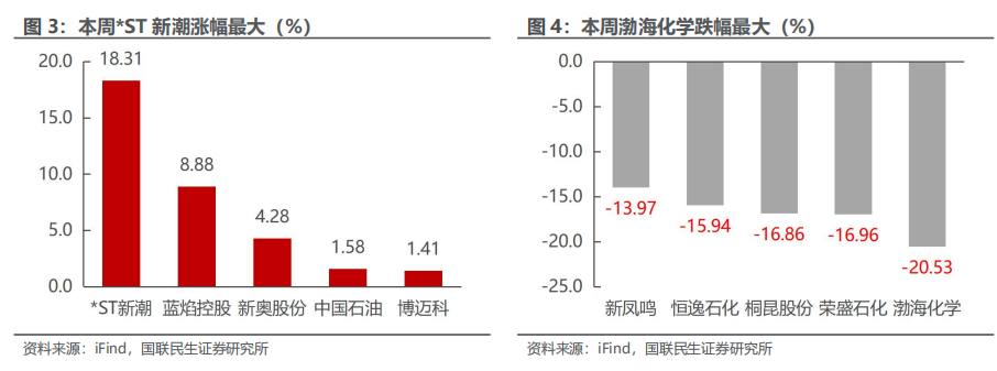 本周*ST新潮(维权)涨幅最大。截至3月20日,石油石化行业中,公司周涨跌幅前5位分别为:*ST新潮上涨18.31%,蓝焰控股上涨8.88%,新奥股份上涨4.28%,中国石油上涨1.58%,博迈科上涨1.41%。